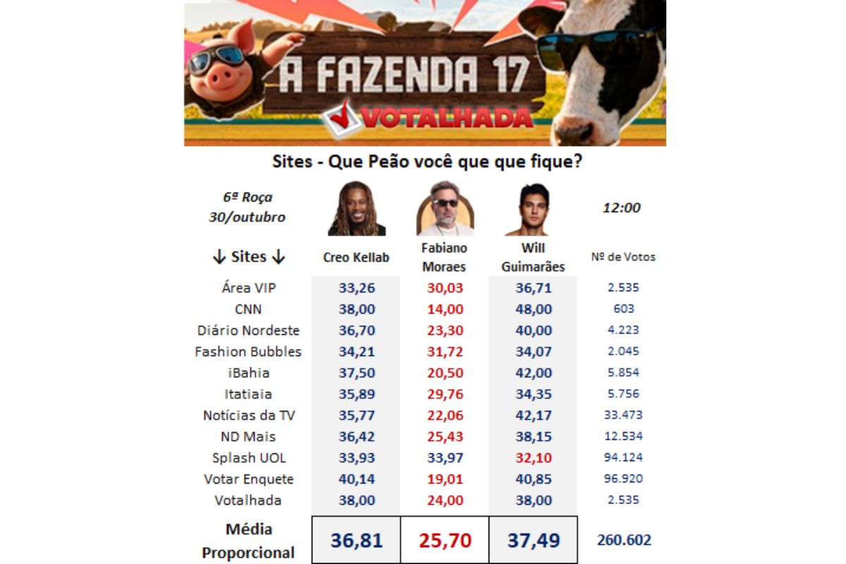 De acordo com o portal Terra, as enquetes mais recentes da 17ª edição de A Fazenda mostram quem o público deseja eliminar do reality. Os participantes Creo, Fabiano e Will aparecem na roça e correm risco de deixar a competição milionária, de acordo com as votações online.