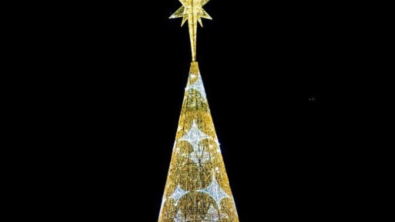 Com 57 m de altura, a estrutura permanece como a maior árvore natalina da capital e deve voltar a atrair multidões ao parque.
