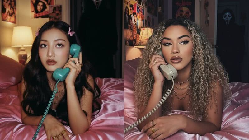“Crie uma foto em estilo retrato y2k de mim deitada sobre um lençol de cetim roxo e brilhante, segurando um grande telefone com fio dos anos 90. Eu estou em uma posição sonhadora e pensativa. Estou usando joias delicadas, incluindo colares e acessórios de ouro finos, além de anéis de caveira dourados e robustos. O quarto atrás de mim é feminino e sonhador, decorado com pôsteres dos anos 90. A imagem deve ter um estilo granulado, típico da época, e iluminação suave, como a de um quarto à noite. Ao meu lado há uma tigela de pipoca e revistas antigas. O assassino Ghostface, do filme Pânico, aparece ao fundo, de pé na porta de um corredor escuro e ameaçador, olhando fixamente para mim. Mantenha meus traços faciais originais.”