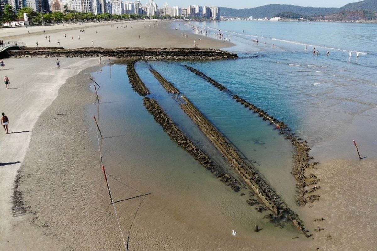 O mar de Santos (SP) revelou novamente parte de sua história. O veleiro inglês Kestrel, encalhado há mais de 130 anos, voltou a aparecer na praia do Embaré, próximo ao canal 5. Os destroços, agora visíveis na faixa de areia, despertam curiosidade entre banhistas e moradores que passam pelo local.