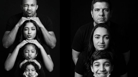 “Faça um retrato dramático em preto e branco de estúdio de uma família divertida, empilhadas verticalmente em uma pose criativa. Família de [quantidade] pessoas, fotos em anexo. O pai está ao fundo/acima, com as mãos delicadamente apoiadas na cabeça da mãe, fazendo uma expressão engraçada de biquinho e piscando o olho.