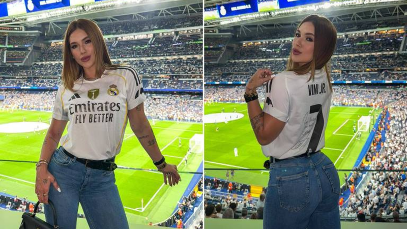 No último sábado (4), a influenciadora foi vista no estádio Santiago Bernabéu, em Madrid, assistindo ao jogo do Real Madrid e chamou atenção ao usar uma camiseta com o nome do jogador. Pouco depois, fãs começaram a especular que o gol marcado por Vini teria sido uma homenagem a ela.