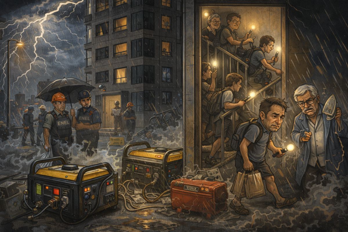 Enquanto a Enel fala em obras complexas, estudos técnicos e agenda marcada, moradores relatam apagões, escadas de 20 andares vencidas no braço e geradores que não dão conta quando a chuva aperta.
