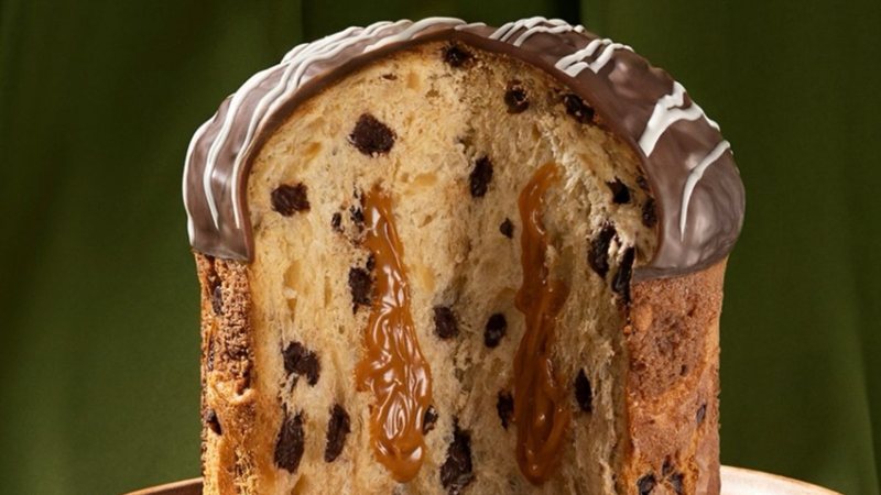 A parte de dentro do panetone traz um recheio bem líquido, enquanto o topo ganha uma camada grossa de chocolate. Ideal para os chocólatras.