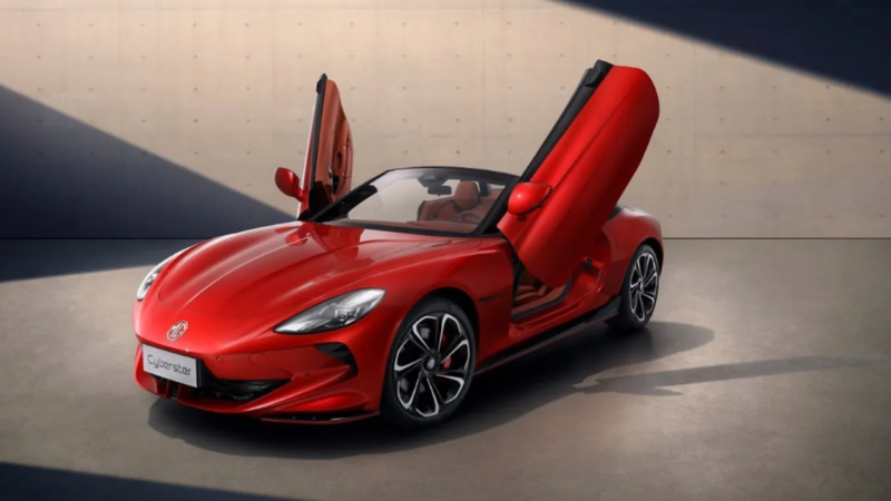 O MG Cyberster, 100% elétrico e conversível, tem 510 cv de potência e acelera de 0 a 100 km/h em 3,2 segundos. A autonomia chega a 342 km, e a recarga rápida (10% a 80%) leva 38 minutos.