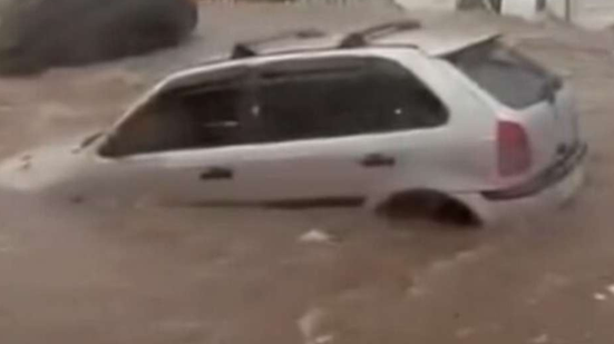 No mesmo momento, o registro mostra um carro Renault Sandero vermelho, que também foi levado pela água logo em seguida. O motorista do veículo foi resgatado com vida e passa bem de saúde.