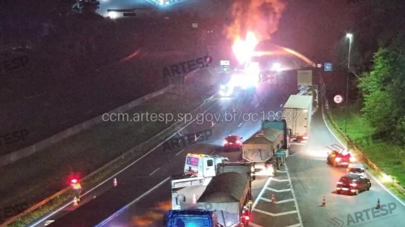 Uma carreta tombou e pegou fogo na madrugada desta quinta-feira (16), provocando a interdição de um trecho da Rodovia dos Imigrantes, em São Bernardo do Campo, na Grande São Paulo, por quase uma hora.