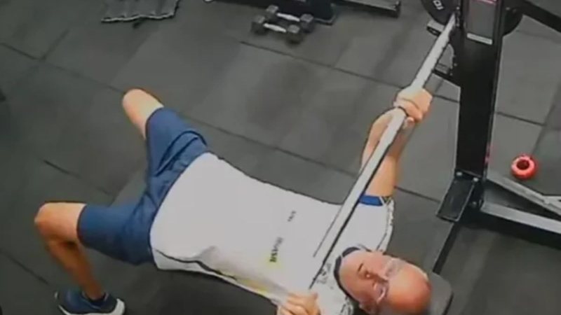 Nas imagens, Ronald aparece deitado no banco de supino realizando o movimento quando, de repente, a barra escapa de suas mãos e despenca diretamente sobre o peito.
