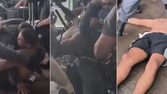 As imagens, que circulam nas redes sociais, registram o momento em que um agente aplica um golpe de estrangulamento conhecido como mata-leão, enquanto outros policiais desferem socos e golpes de cassetete. O homem perde a consciência antes de ser algemado.