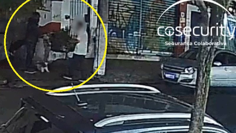 Pouco tempo depois, um homem aparece caminhando pela calçada com seu cachorro, sem perceber a aproximação dos assaltantes.