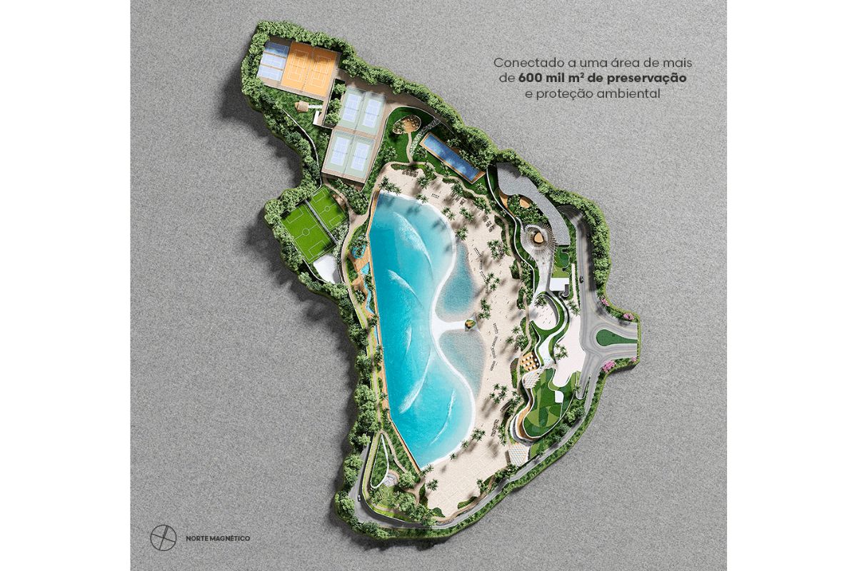 A proposta inclui piscina de ondas, faixa de areia com cerca de 12 mil metros, além de áreas esportivas e de lazer. A área total do projeto ultrapassa 900 mil metros quadrados, com previsão de integração a áreas verdes no entorno.