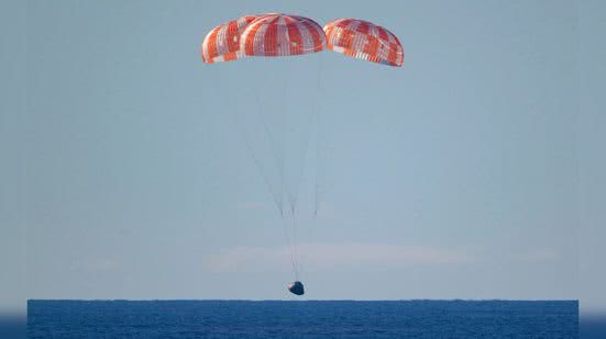 O splashdown ocorre no Oceano Pacífico, próximo a San Diego, na Califórnia. Apesar de controlado, o impacto ainda é comparável a uma desaceleração brusca, mas dentro dos limites seguros.