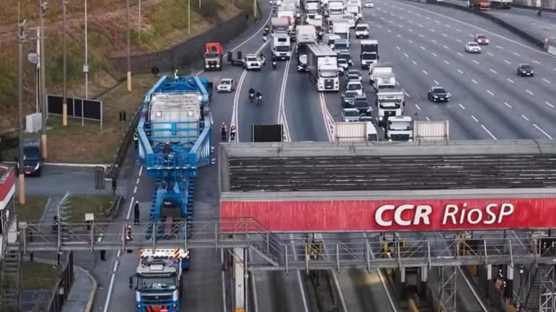 Uma estrutura com 120 metros de comprimento, 380 pneus e mais de 850 toneladas de peso bruto total chamou a atenção de motoristas ao provocar interdições temporárias na Rodovia Presidente Dutra, em São Paulo.