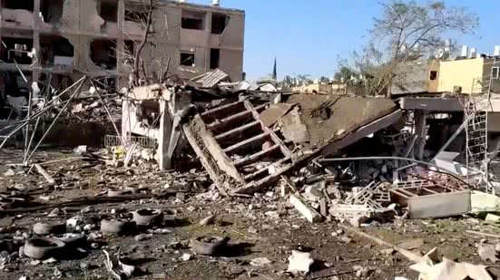 Imagens divulgadas por equipes de socorro mostram prédios e outras construções com danos severos: paredes externas destruídas, estruturas comprometidas e fumaça ainda saindo de áreas atingidas.