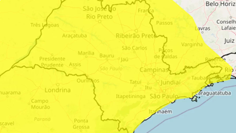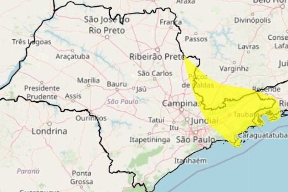 O Instituto Nacional de Meteorologia (Inmet) emitiu um alerta amarelo para tempestades em todo o estado de São Paulo. O aviso, que indica “perigo potencial”, começou à 0h e segue válido até as 23h59 desta segunda-feira (29), abrangendo todas as regiões paulistas.