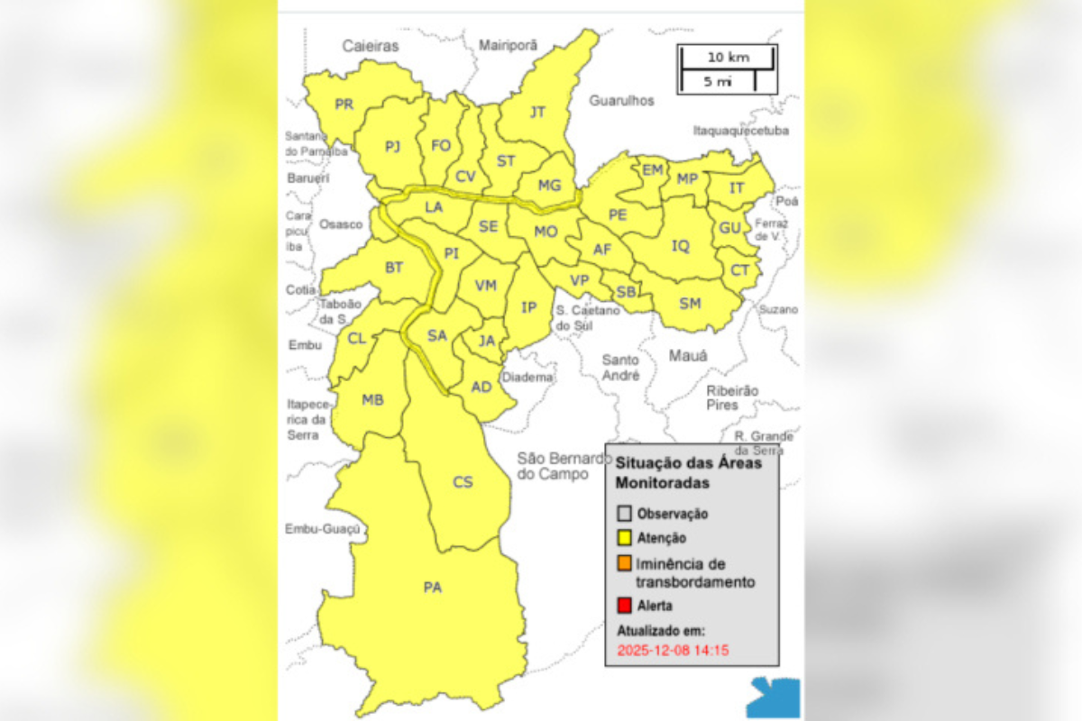 A tarde desta segunda-feira (8) começou com temporais na capital paulista, levando toda a cidade ao estado de atenção para alagamentos. A Defesa Civil também acionou alerta para raios, ventos intensos e possibilidade de granizo em diferentes regiões da capital.